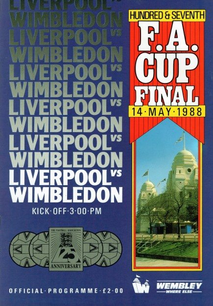 Excellent condition programme from the 1988 FA Cup Final, Liverpool v Wimbledon. Unfancied Wimbledon took on the League Champions Liverpool. Very few away from the “Crazy Gang”, who a little over a decade earlier were a non league team, fancied getting anything from this match and to many were there just to make the numbers up. Vinnie Jones, John Fashanu, Dennis Wise and ultimately Dave Beasant who became the first keeper to save a penalty in a FA Cup Final (missed by John Aldridge), all had other ideas. Lawrie Sanchez scored to give Wimbledon a unforgetfull famous FA Cup Final win. Unfortunately for Wimbledon, just like Coventry the year before, Wimbledon were denied a European Competition place because of the ban on English clubs competing in domestic European competitions!